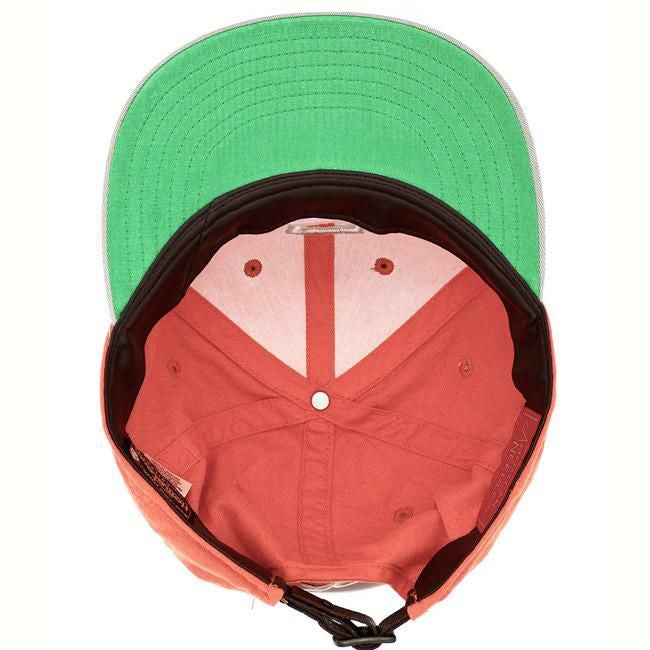 ツバはフラットバイザー仕様で6パネル、後部のレザーストラップアジャスターでサイズ調整が可能。
