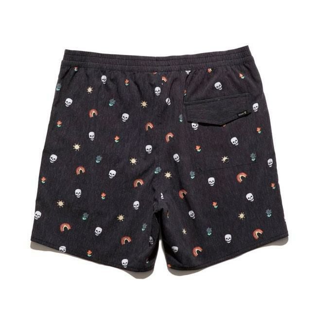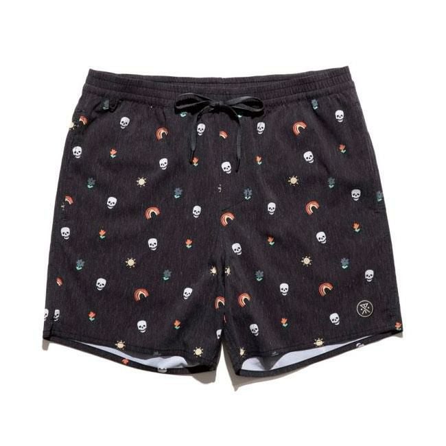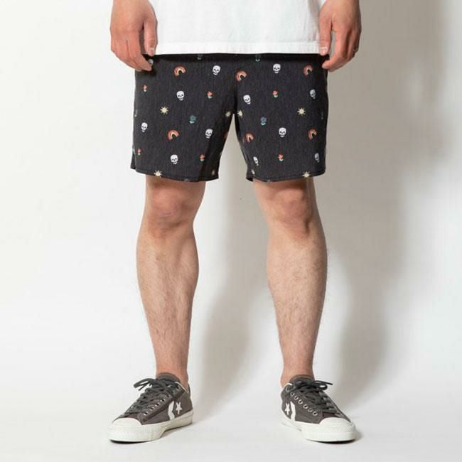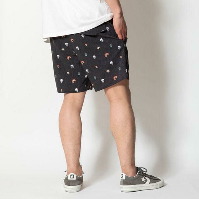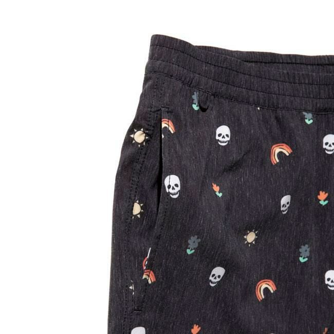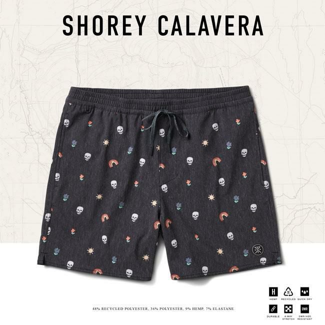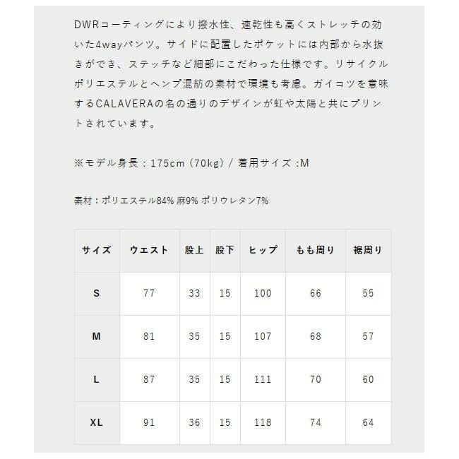 DWRコーティングにより撥水性、速乾性も高くストレッチの効いた4wayパンツ。サイドに配置したポケットには内部から水抜きができ、ステッチなど細部にこだわった仕様です。リサイクルポリエステルとヘンプ混紡の素材で環境も考慮。ガイコツを意味するCALAVERAの名の通りのデザインが虹や太陽と共にプリントされています。