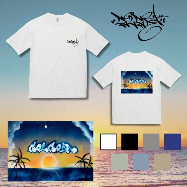 海に沈む夕陽、照らされるパームツリー、そして空に浮かぶグラフィティロゴ。