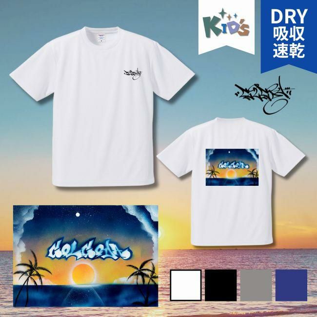 海に沈む夕陽、照らされるパームツリー、そして空に浮かぶグラフィティロゴ。