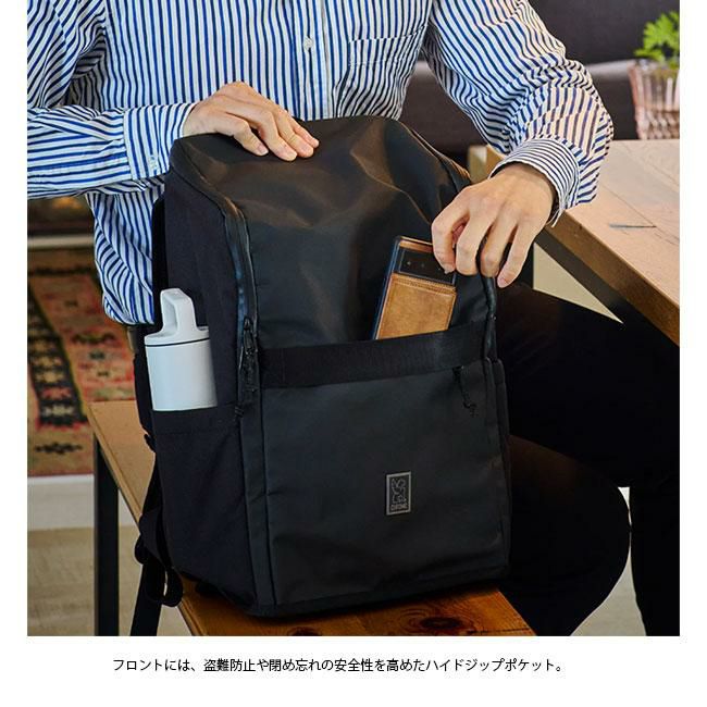 容量は21Lで16inchのPCまで収納可能。特徴的なセミオープンジップトップは、視認性が高いことで荷物の出し入れがしやすく、開くと現れる上下からアクセス可能な伸縮ポケットは周辺機器の収納に最適。