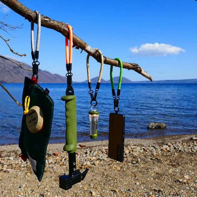 普段使用しているスマートフォン、ハンマー、LEDランタンなどに装着して『ハンドストラップ』として使うのはもちろんのこと、登山やスノーボードなどでの落下防止の『リーシュ』として、ポーチやカゴなどに取り付けて『グラブハンドル』にすることなど、発想次第で用途は多岐にわたります。