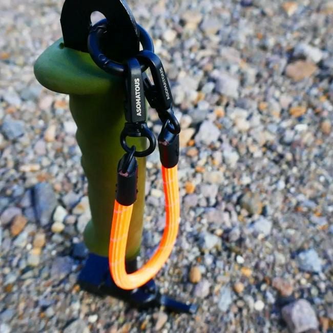 装着対象側をリングカラビナ、ストラップ両端の2点をカラビナ状にすることで、驚きの汎用性を生み出しています。