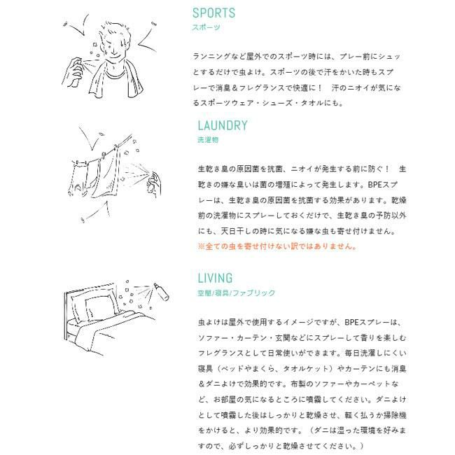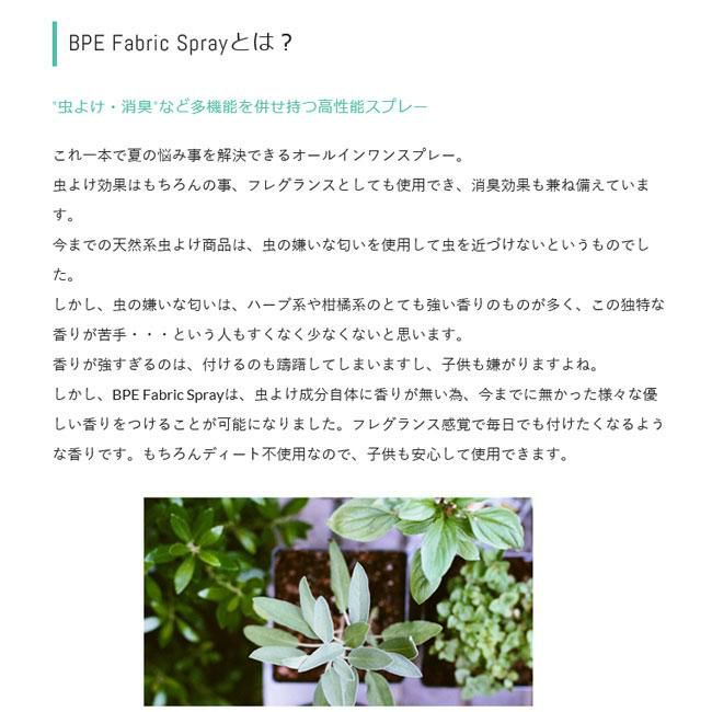 BPEファブリックスプレーとは、「虫よけ・消臭・フレグランス」の多機能を併せ持ったスプレーです。