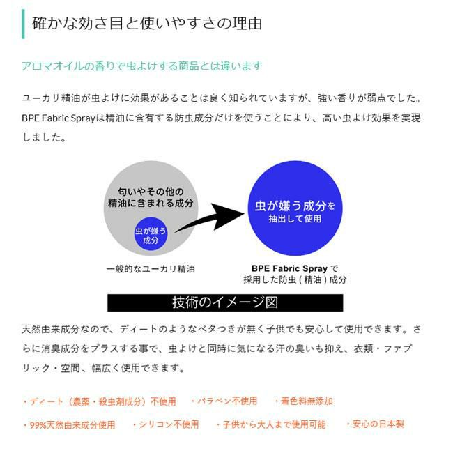BPEファブリックスプレーは、ユーカリ精油に僅かに含まれる虫よけ成分だけを使うことにより、高い虫よけ効果を実現。