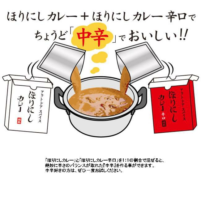 「ほりにしカレー」と「ほりにしカレー辛口」を1:1の割合で混ぜると、絶妙に辛さのバランスが取れた『中辛』を作る事ができます。