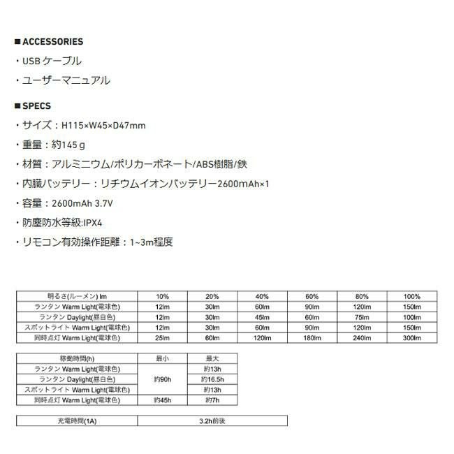 ■点灯時間:最小モード90h~45h/最大モード16.5h~7h