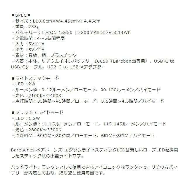 Barebones ベアボーンズ エジソンライトスティックLEDは新しいロープLEDを採用したスティック状の小型ライトです。