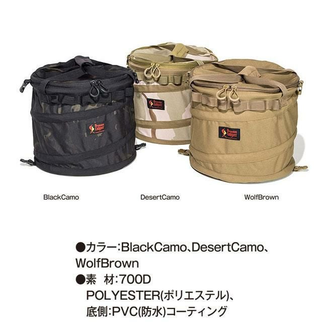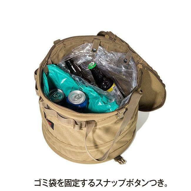 テント内での使用をイメージした、折りたたみ式のゴミ箱。内側のスナップボタンで、ゴミ袋を固定することができます。袋を分けて装着すれば分別も可能。このミニサイズなら、ご家庭にあっても違和感なく、普段使いできるアイテムです。