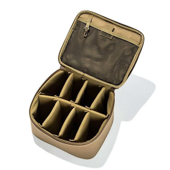 M-FLATの1.5倍の高さがある、セミハードギアバッグ M-FLAT PLUSです。食器類や小型ランタンなど、少し高さのあるギアを収納するのに便利。仕切り板(大)が1枚、(小)が6枚付属しており、最大8ルームに小分けでき、収納するギアに合わせたアレンジが可能です。蓋の裏側にはメッシュポケットとフックが付いています。