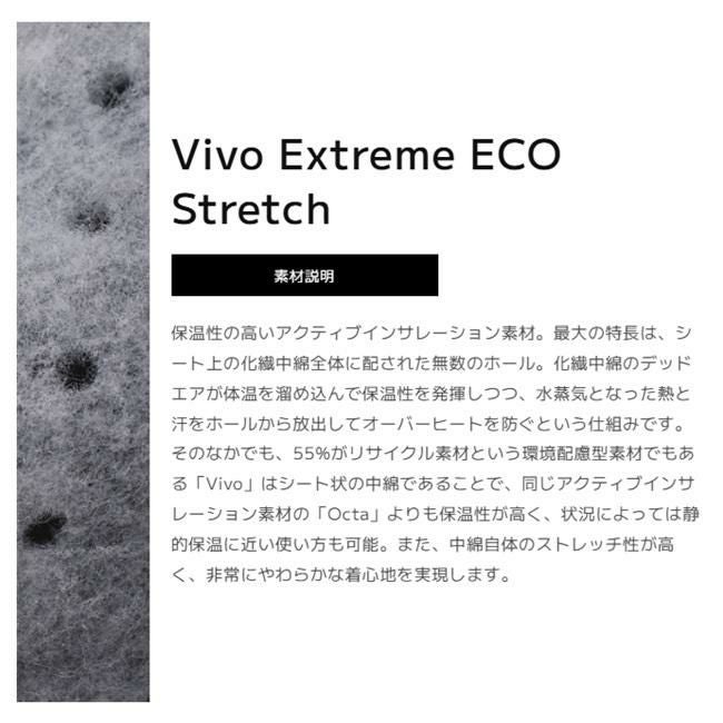 表地はストレッチ性に優れるDWR(耐久撥水)加工済の「Primeflex」、中綿はソフトな「Vivo Extreme ECO Stretch」で、保温性と通気性、ストレッチ性を兼ね備えています。