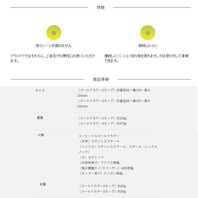 他の画像を見る 細挽きから粗挽きまで粒度の調整が可能 コーヒーミル ゴールドカラー3カップ 手動 HIGHMOUNT ハイマウント コーヒー キャンプ グランピング アウトドア 春夏 秋冬 定価 ¥ 2,750 のところ 特別価格 ¥ 2,200 税込 在庫切れ 詳細を見る お気に入りに登録する