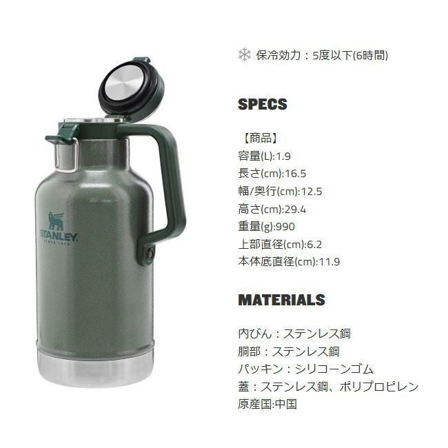 他の画像を見る 水筒 ボトル 保冷 グラウラー ビール Beer スタンレー クラシック真空グロウラー 1.9L STANLEY ボトル ビール グラウラー 炭酸 水筒 キャンプ アウトドア 定価 ¥ 10,780 のところ 特別価格 ¥ 9,988 税込 在庫切れ カートに入れる お気に入りに登録する