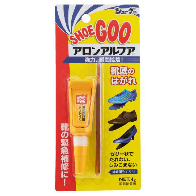 シューグー×アロンアルフア」は、瞬間接着材「アロンアルフア」の東亞合成株式会社の協力により開発された、靴底剥がれなどの貼り合わせに特化した瞬間接着剤です。