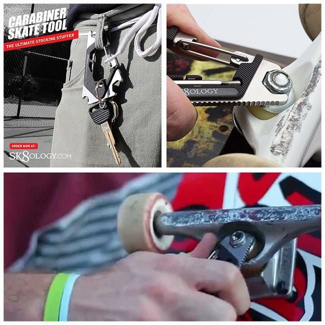 :カリフォルニア、サンディエゴに本社を置き、常に新たな視点でスケート関連用品を生み出すSK8OLOGY社(スケートオロジー社)製のカラビナツールはカラビナ自体に3つの異なるレンチと付属の六角レンチ+のスクリューが本体に収納。