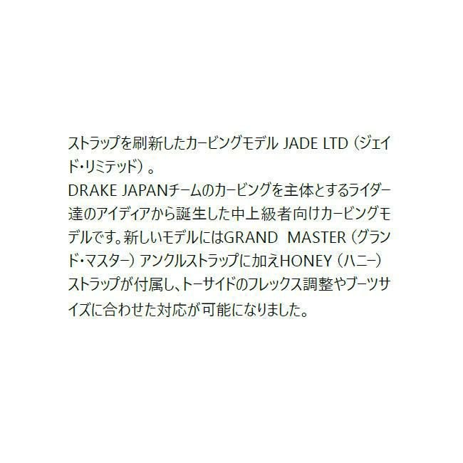 DRAKE JAPANチームカービングを主体とするライダー達のアイディアから誕生した中上級者向けカービングモデル。“SPEED & STYLE”をテーマにオリジナルデザインで登場。グランドマスター・ストラップを装備したスペシャルなモデルで、ノーマルストラップに比べブーツとの密着度が上がることでダイレクトなパワー伝達が可能。