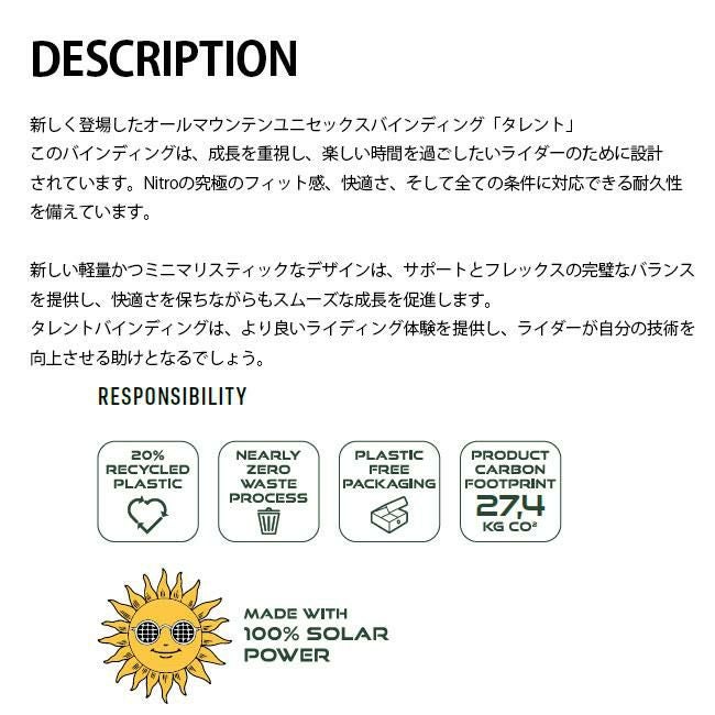 NITRO/NITRO BINDING/TALENT/タレント/2025/2026/25-26モデル/スノーボード バインディング メンズ/スノーボード バインディング レディース/ユニセックスモデル/初心者向け/中級者向け/オールマウンテン対応/軽量/柔らかめ/扱いやすい/成長サポート/正規取扱店/NITRO正規品/GOLGODA/名古屋スノーボードショップ