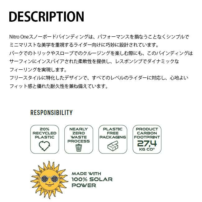 NITRO/NITRO BINDING/ONE/ワン/2025/2026/25-26モデル/スノーボード バインディング メンズ/フリースタイルバインディング/サーフスタイル/ジブ/ジャンプ/サイドヒット/スタイル重視/快適フィット/中級者向け/上級者向け/軽量バインディング/正規取扱店/NITRO正規品/GOLGODA/名古屋スノーボードショップ