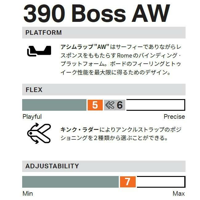 ▼ 関連キーワード(スラッシュ区切り) ROME/390 Boss/ローム/バインディング/スノーボード/スノボ/アシムラップ/グラトリ/ジブ/地形遊び/オールマウンテン/中上級者/UltraFlex/ProGrip/AuxTech/サーフスタイル/軽量/調整可能/2025-2026モデル