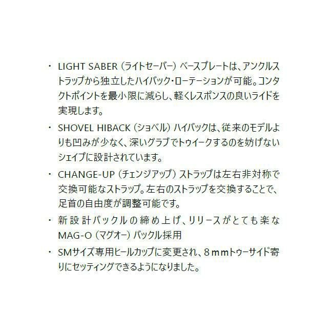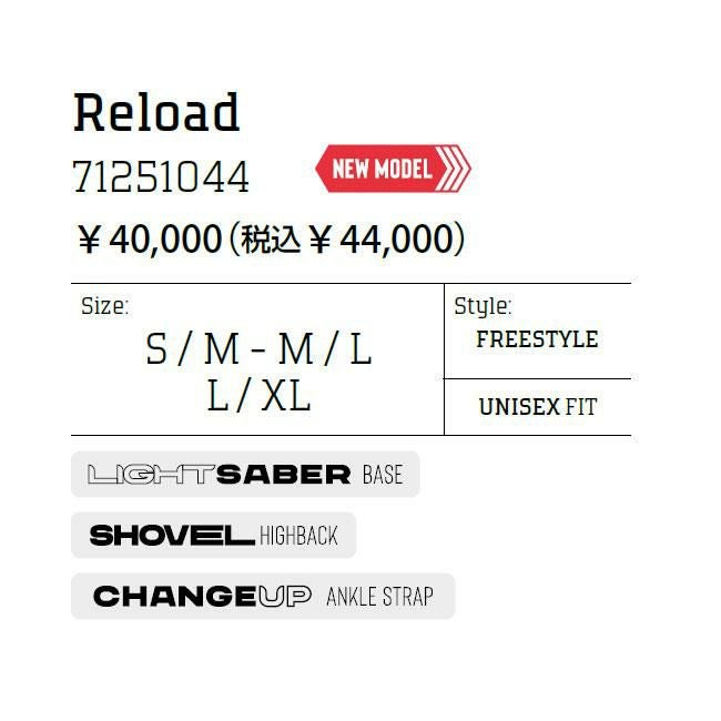 気分も見た目もクールになりました。インジェクションTPU製の新しいCHANGE-UPストラップは、ストラップを左右入れ替えることで、足首の自由度を調整することが出来ます。スタイリッシュでサイドフレックスが柔らかいSHOVEL HIBACKは、快適さとトゥウィーカビリティを向上させました。ソフトフレックスで反応がいいバインディングをお探しなら迷わずRELOADです。