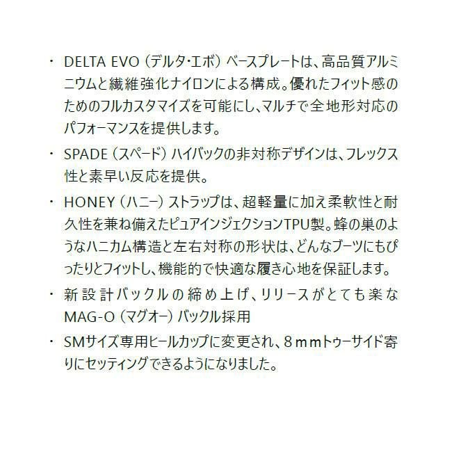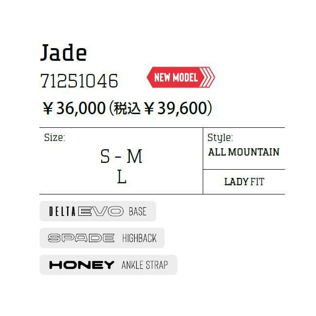 JADE(ジェイド)は、より安心感を与え、信頼できる仲間を得たような感覚にしてくれるバインディングです。レディースコレクションの中でも最高品質のハイエンド製品に生まれ変わりました。どんなブーツにもぴったりフィットするハニー・ストラップは見た目もスッキリで羽のように超軽量。新設計のDELTA EVO(デルタ・エボ)ベースプレートは、ライディングフィールにダイレクト感を提供します。