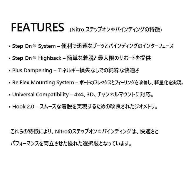 NITRO/NITRO BINDING/STEP-ON/ステップオン/2025/2026/25-26モデル/オールマウンテンバインディング/簡単装着/ステップイン/中級者向け/初心者向け/スノーボード バインディング レディース/スノーボード バインディング メンズ/クイックエントリー/快適装着/レスポンス/ブーツ連動/Burton対応/工具不要/高操作性/耐久性/スノボ金具/正規取扱店/NITRO正規品/GOLGODA/名古屋スノーボードショップ