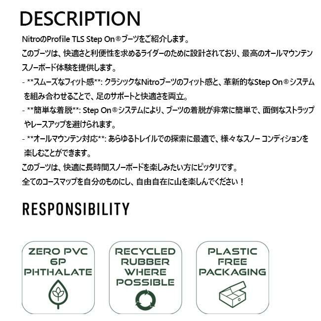 NITRO/NITRO BOOTS/PROFILE TLS/STEP-ON/ステップオン/2025/2026/25-26モデル/スノーボード ブーツ メンズ/オールマウンテンブーツ/中級者向け/上級者向け/スノボブーツ/快適フィット/スピード装着/TLSシステム/Vibramソール/Cloud 9 Liner/Burton対応ブーツ/正規取扱店/NITRO正規品/GOLGODA/名古屋スノーボードショップ
