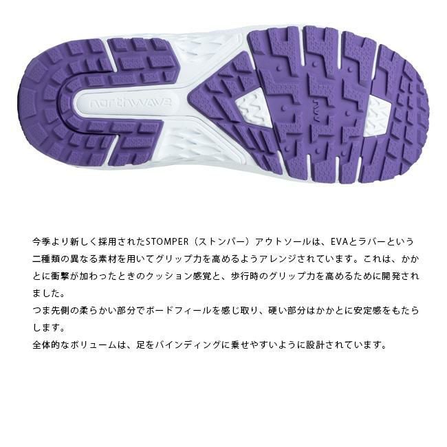 今季より新しく採用されたSTOMPER(ストンパー)アウトソールは、EVAとラバーという二種類の異なる素材を用いてグリップ力を高めるようアレンジされています。これは、かかとに衝撃が加わったときのクッション感覚と、歩行時のグリップ力を高めるために開発されました。つま先側の柔らかい部分でボード