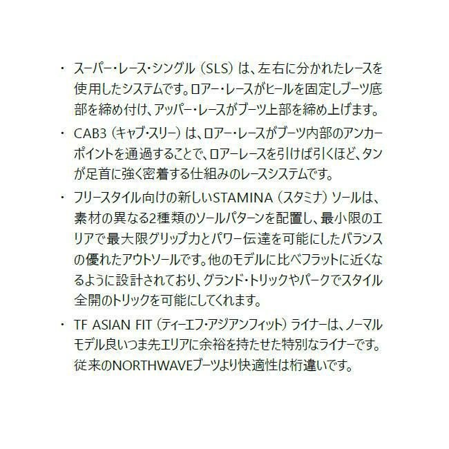 可能です。さらにNORTHWAVEのラインナップの中で唯一ASIAN FITライナーを採用。つま先からふくらはぎまで包み込むようなフィット感を