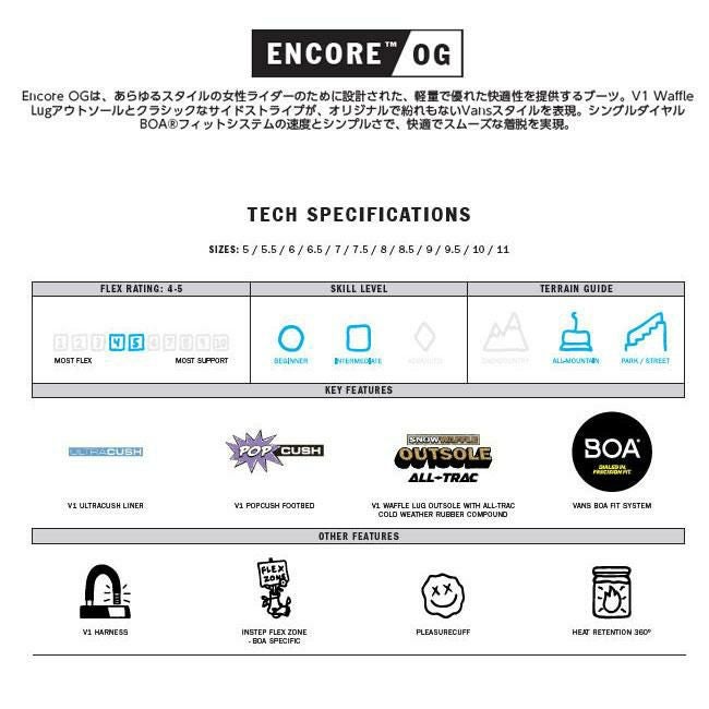 【関連キーワード】 VANS ENCORE OG / VANS エンコア オージー / バンズ レディース ブーツ / スノーボードブーツ レディース / BOA ダイヤル ブーツ / 軽量 スノボ ブーツ / 初心者向け レディースブーツ / グラトリ 向き ブーツ / パーク向け スノボブーツ / VANS レディース スノーボードブーツ / GOLGODA 正規販売店