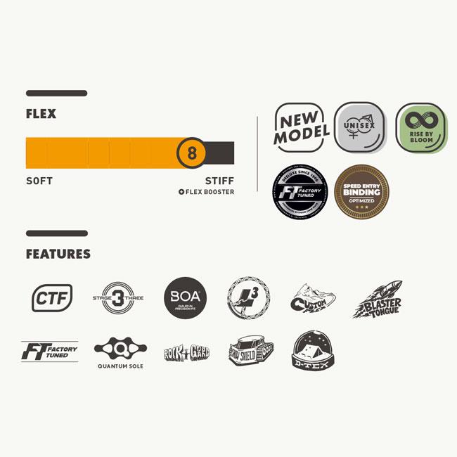 DEELUXE 26-27「DEEMON PRO」は、オールラウンド性能を極めたフリーライドフラッグシップモデル。フレックス8設計により、高速域の安定性とフリースタイルでの操作性を両立。Rapid React Modular TechnologyによるFactory Tuned仕様で、瞬時の反応と精度を実現する万能ハイパフォーマンスブーツです。