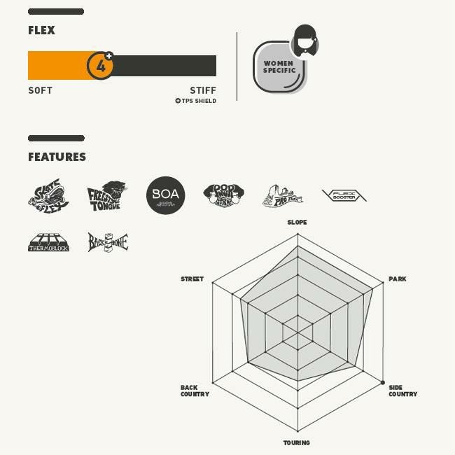 驚異の軽さを誇るDEELUXEのベストセラーレディースモデル。ソフトなフレックスながらもしっかりと足首をホールドしてくれるのでパークジャンプやアイテムなどでもボードをコントロールしやすく、スタイルも出しやすい。また搭載されているD-LUGソールは足裏感覚が良く、かかと部分にはSLYTECHという素材が内蔵されておりジャンプなどの衝撃もしっかり吸収してくれる。搭載されているサーモブロックにより保温性も高い。ジブ・パーク・フリースタイル適応。
