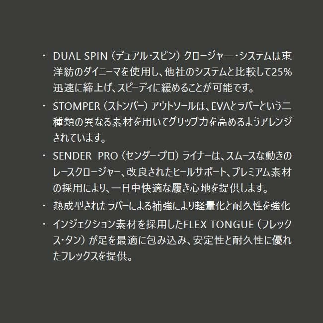 ●このBadBoyは長い間私たちのよりどころでした。あらゆる衝撃に耐えるように作られたブーツで、ナショナルチームのライダーであるNicholasHuberによってテストされ、衝撃を簡単に吸収するDouble CrossbowVibramSoleにより、大きなキッカーを攻めたくなる衝動にかられます。NORTHWAVEのSPINテクノロジーは何年も前から存在していますが、これまでこのように使用されたことはありませんでした。1つめのSPINシステムは、ブーツのタンを足首に沿いぴたりと引き込んで足首を所定の位置に固定するHeelLockerRetentionSystem専用に割り当てられています。2番目のSPINダイヤルはブーツの前面をとれも完璧にフィットさせてくれます。それでも不十分な場合のために、パワーストラップを追加しました。これにより、さらに非常にタイトなフィーリングに調整できます。新しくなったTF PROライナーを忘れないでください。これにより、一日中足を快適に過ごすことができます。