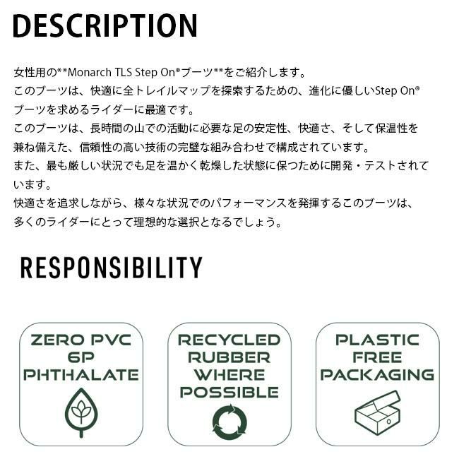 NITROの女性専用ブーツ「MONARCH TLS STEP-ON」は、BurtonのSTEP-ONシステムに完全対応し、あらゆるコンディションでも快適に滑りたい女性ライダーに向けて設計された1足。