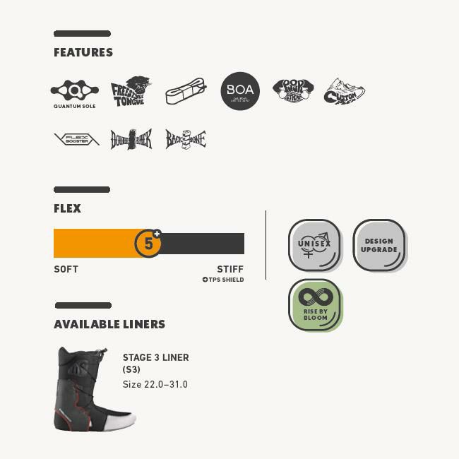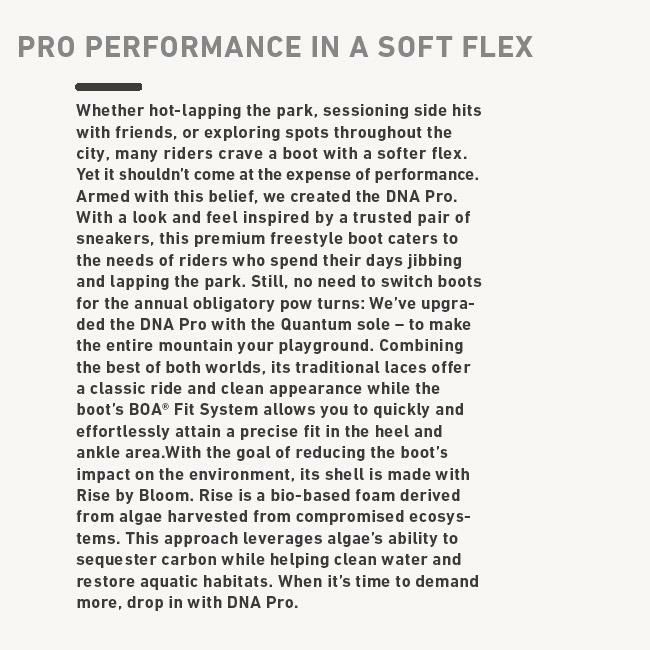 極限まで薄く足裏感覚を高めたスケートソールは雪面状況を鋭くキャッチし、刻一刻と変わるコンディションに素早く対応することができる。シュレースとパワーベルトで細かいフレックス調整も可能。