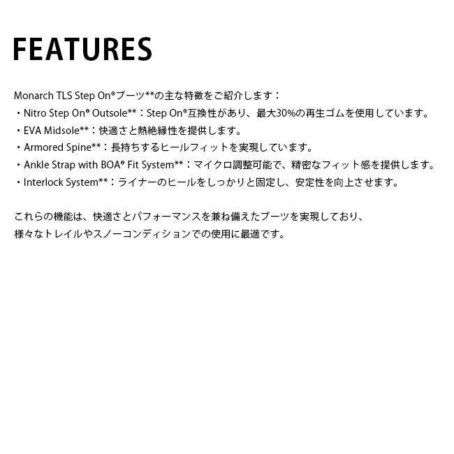 他の画像を見る 25-26モデル 快適×簡単装着!冬山をもっと自由に 正規品 ナイトロ ブーツ NITRO MONARCH STEP ON BOOTS 25-26 レディース ブーツ ステップオン対応 女性専用モデル 定価 ¥ 74,800 のところ 特別価格 ¥ 63,599 税込 カートに入れる お気に入りに登録する