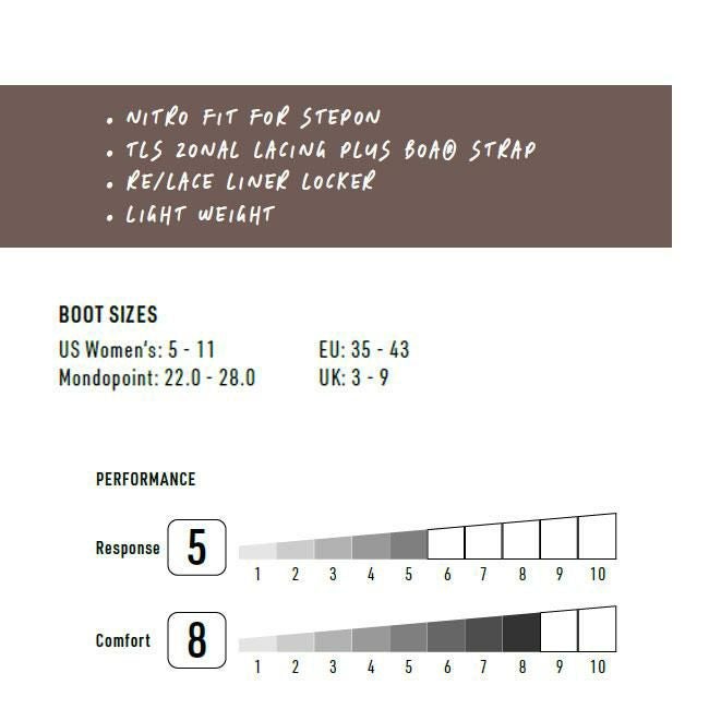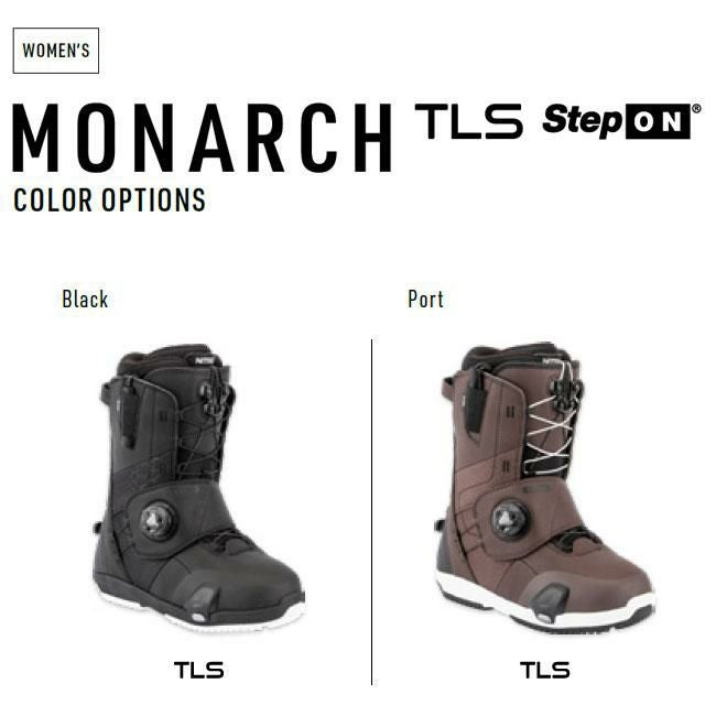NITROの女性専用ブーツ「MONARCH TLS STEP-ON」は、BurtonのSTEP-ONシステムに完全対応し、あらゆるコンディションでも快適に滑りたい女性ライダーに向けて設計された1足。