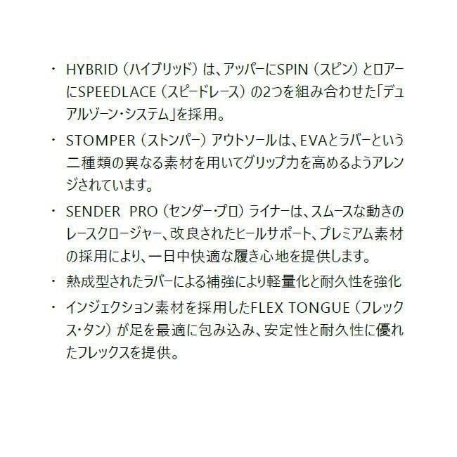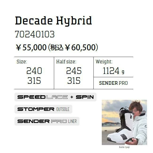 ●DECADEHYBRIDは、HeelLocker、SPINシステム、POPCORNアウトソールなどの最新テクノロジーを採用したまったく新しいブーツです。これらすべてによってDECADEHYBRIDは美しいフォルムを与えられました。このモデルは、DOMAINほどハードではありませんが、EDGEほどソフトではありません。程よいフレックスを保ちながら快適なフィット感があるため、チームのファーストチョイスです。ブーツのアッパーエリアを締め上げるのに最適なSPINシステムはブーツ全体を締め上げる時間を短縮するだけでなく、素早い準備を可能にしあさイチのストレスを軽減してくれます。POPCORNアウトソールは、ライディング中のすべての衝撃を吸収しダイレクトなエッジングを可能にしてくれます。