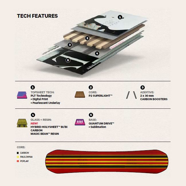 足元がキャンバーで、さらに縦に2本入ったカーボンファイバービームの採用で、フレックスもトーションも程よく強く絶妙なバランスが実現し、長年の経験と開発から生まれたシェイプは、フリーライディング、カービングやパークまでゲレンデ全体をこの1本で楽しめるように完璧に設計されている。 フレックスは女性の為に少し柔らかめに設定され、軽量で誰でも扱いやすいボードに仕上がっている。