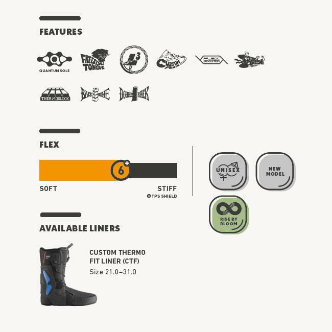 インナーの代名詞ともなった「サーモインナー®」と呼ばれる熱成型インナーを武器に、幅広いスノーボーダーに人気のオーストリアのスノーボードブーツ専門ブランド。DEELUXEのサーモインナー®は、専用のオーブンで熱成型することにより、足とインナー、インナーとアウター、さらにはインソールに至るまですべてを一体化させることができる。それは言い換えれば、一人ひとりの足型に合わせたブーツを提供するということが可能なブランドです。