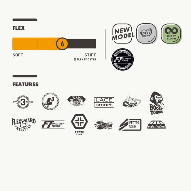 ▼ DEELUXE 26-27 ID TEAM PRO LTD. S3は、30周年を記念してリリースされた限定フリースタイルモデル。フレックス6設計により、高反発かつ高レスポンスを実現。ジャンプ・パーク・高回転系グラトリまで、スピード域でもブレない安定感と精度を求めるライダーに最適な一足です。