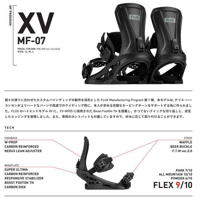 CV MF-05に比べてハイバックの強度が高く、よりハイスピードでのフリーライディングやバンクドスラローム、ハーフパイプ等におけるカービング性能を、大幅に向上させています。