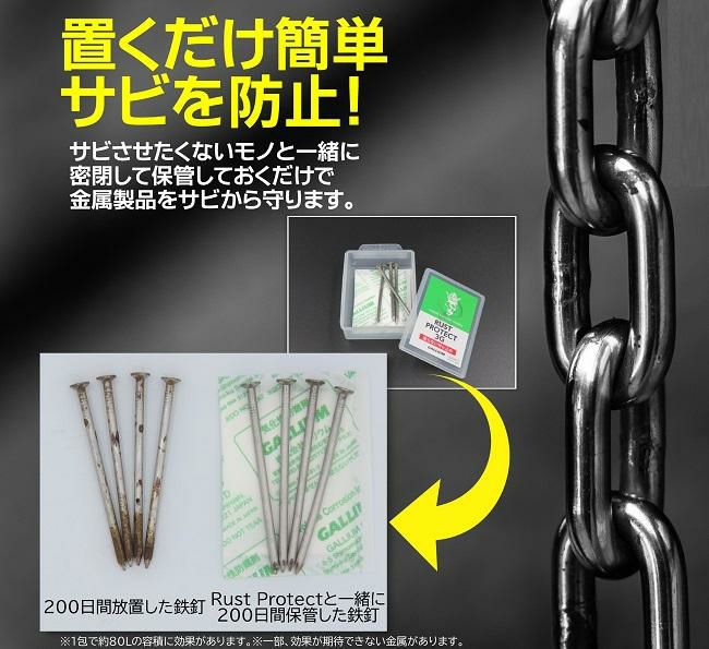 サビさせたくない金属製品と一緒に保管しておくだけで、気化したガスが金属をコーティングして、大切な金属製品をサビから守ります。