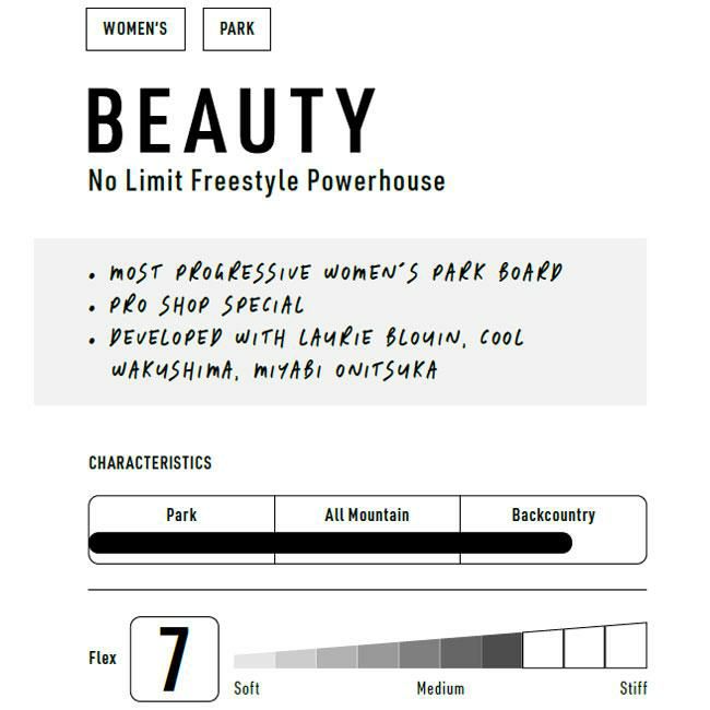 NITRO(ナイトロ)「BEAUTY」は、Laurie Blouin、鬼塚雅、Cool Wakushimaら女性トップライダーと共同開発されたパークライディング特化のフリースタイルボード。
