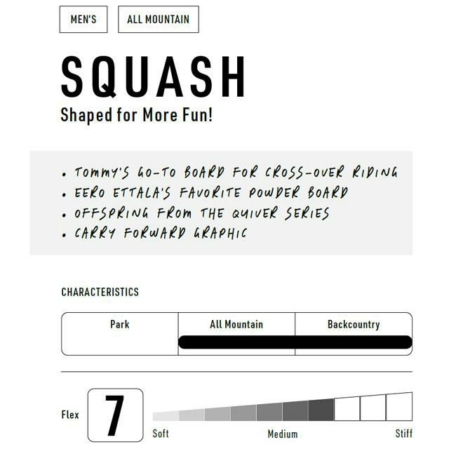 NITRO SQUASH(スカッシュ)は、カービング性能とパウダーでの浮力を高次元で融合させたオールマウンテン対応モデル。伝統的なスワローテール形状が深雪での浮力と安定感を生み出し、プログレッシブサイドカットにより圧雪バーンでの鋭いターンも楽しめます。