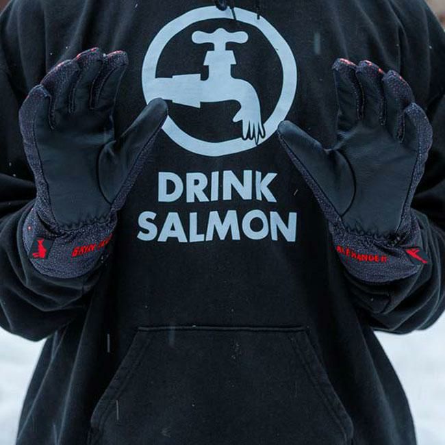 ロングカフのオーバーミットにデカデカとプリントされたサーモンのグラフィックをはじめ、