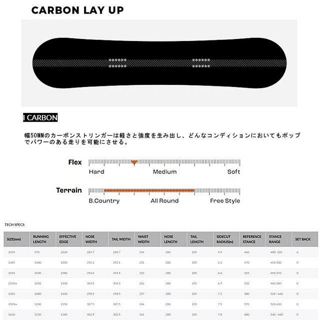 ・I CARBON:幅50mmのカーボンストリンガーは軽さと強度を生み出し、どんなコンディションにおいてもポップでパワーのある走りを可能にさせる。
