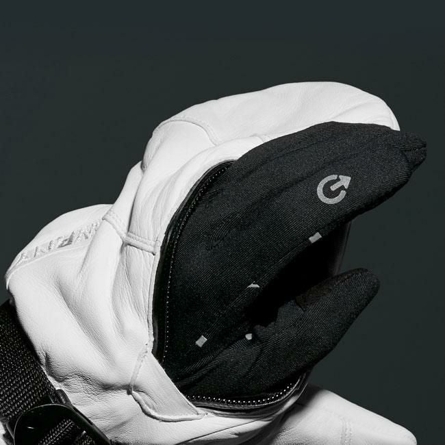 アウターグローブをしたまま、インナーグローブを着用した指が出せる画期的な機能が付いたミトングローブ。