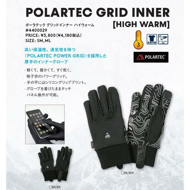 ○eb's(エビス)の「POLARTEC GRID INNER[HIGH WARM]」は、POLARTEC POWER GRID素材を採用した高機能インナーグローブ。優れた保温性と通気性を兼ね備え、ライディング中の手を快適な温度にキープ。シリコングリップでしっかり握れ、タッチパネル操作にも対応。滑走中から休憩中まで快適に使えるハイパフォーマンスモデルです。