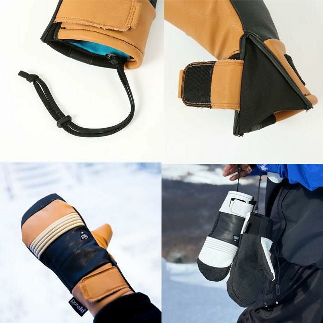 ハードなカービングにも耐えるよう設計されたeb's(エビス)のCARVING MITT STRONGは、ケブラー素材と本革を組み合わせた高耐久ミトングローブ。高強度素材「ARMORTEX」や厚手の中綿、防水透湿インサートなどを採用し、